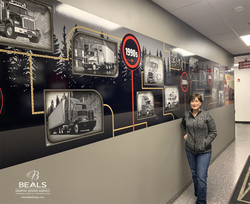 Timeline mural showing vehicles through the last 100 years. This mural spans both sides of a hallway.
